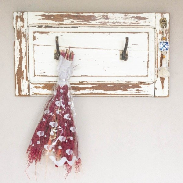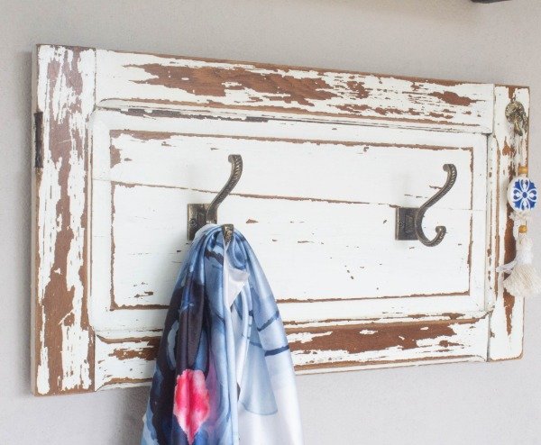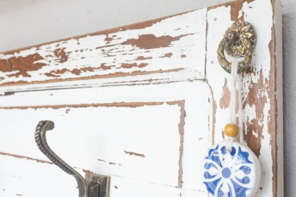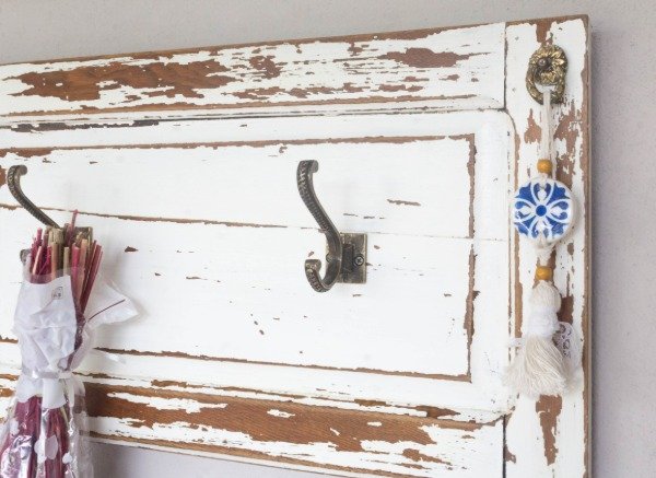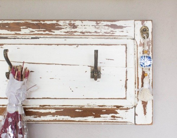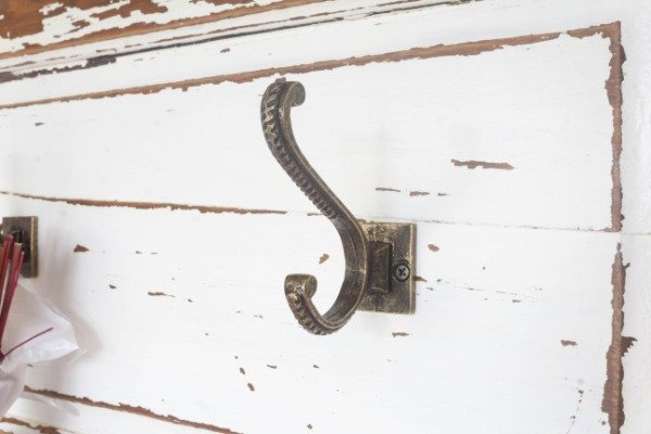 Perchero de madera reciclada en color blanca desgastada. Tiene herrajes en bronce viejo.