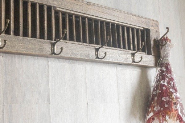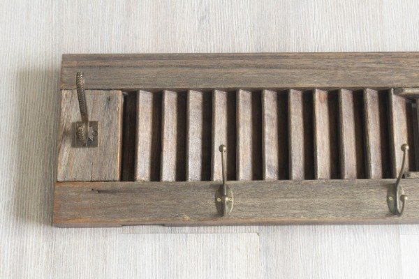 Perchero realizado con postigos con celosía recuperados. Con hermosos detalles y perchas color bronce viejo.